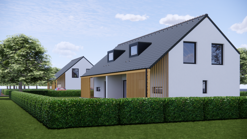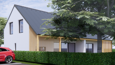 Objekt, hiša in dvojček, bo tlorisnih dimenzij 11x10m, moderno zasnovana, etažnosti P (pritličje) + M (mansarda) s streho dvokapnico v naklonu 40 stopinj. Neto tlorisna površina hiše bo znašala 126 m² + 20 m² pokrite terase.